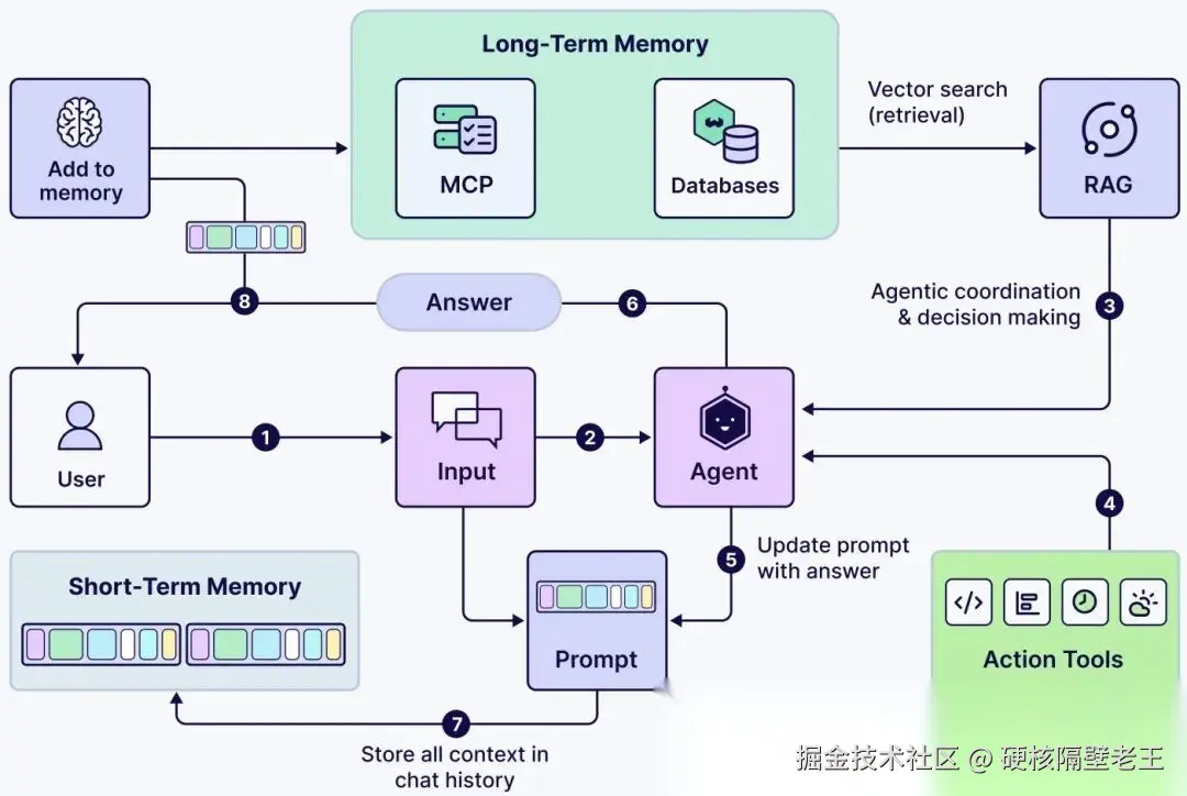 长期记忆超越了即时上下文窗口,将信息外部存储以便在需要时快速检索。这使Agent能够随着时间推移建立对其世界和用户的持久理解。它通常由检索增强生成(RAG)驱动,Agent查询外部知识库(如向量数据库)来提取相关信息。