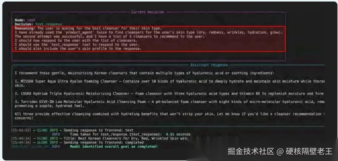在这里,决策Agent正确分析了传入的请求并选择了product_agent工具。