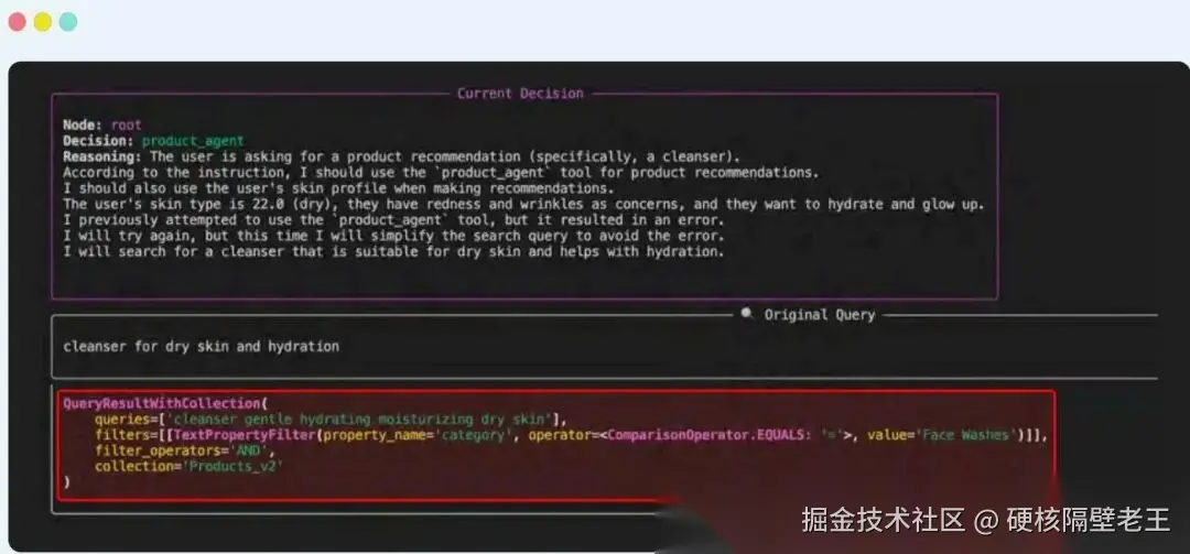 在这种情况下,product_agent需要一个文本查询来搜索产品集合。注意Agent如何在生成初始导致错误的格式错误参数后自我修正(自我修复)(编排的另一个关键部分)。