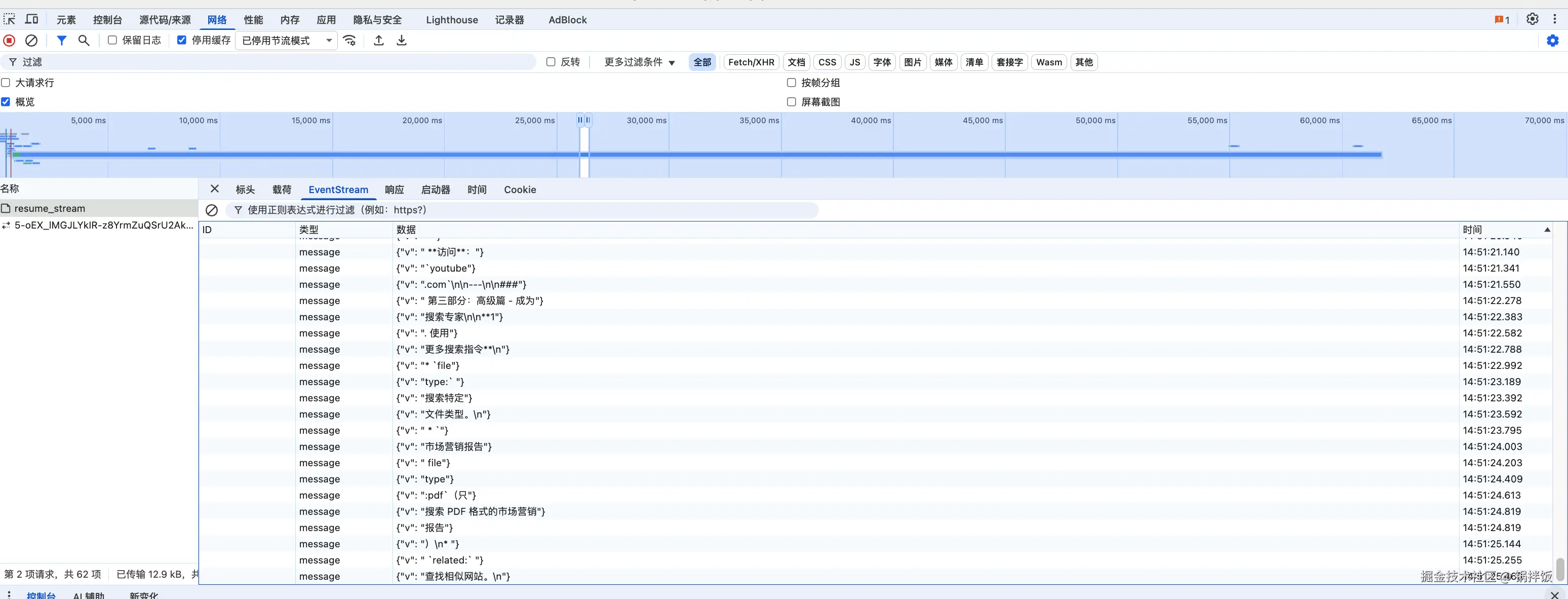 在网页端问问题后,豆包和deepseek都有一个SSE连接,服务端不断向客户端返回问题结果,客户端根据服务端返回内容进行流式输出。