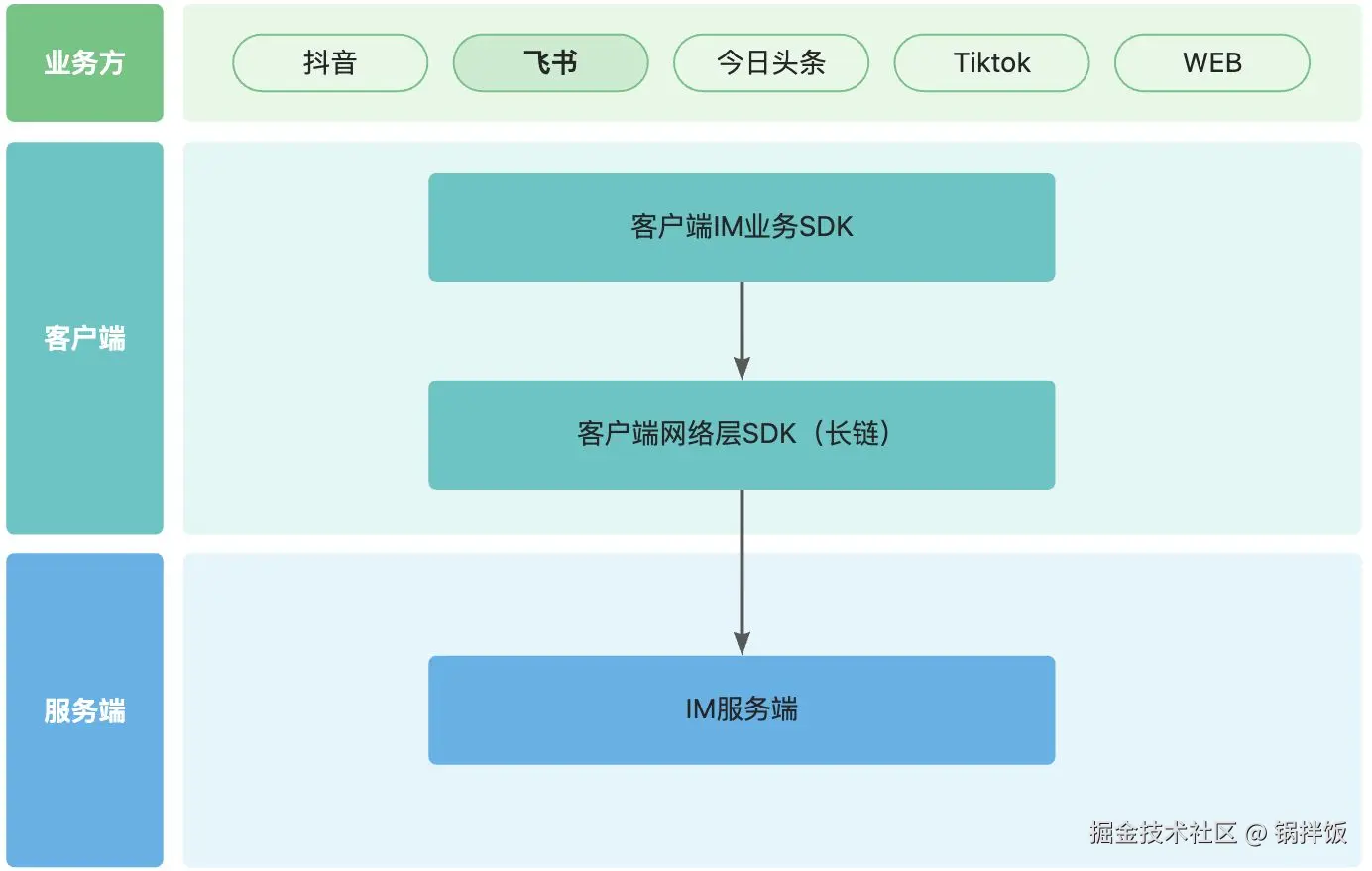 在一个公司中,可能会有多个业务方都用到了IM功能,为避免重复开发,一般会将IM业务封装为SDK,将通用业务下沉到SDK中,方便各个业务方直接使用。以字节跳动为例,正常的架构可能会如下:
