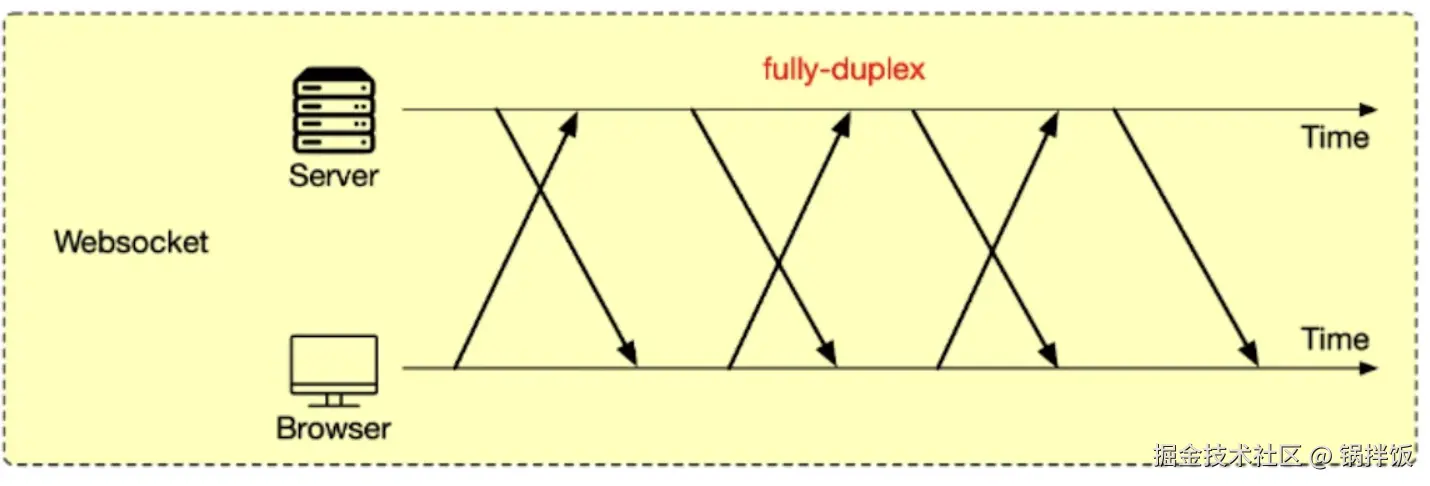 而IM应用中,在会话中,尤其是群聊会话中,在接受消息的同时,还可以多次发送消息,当然我们可以采用SSE+多个HTTP的框架,SSE负责服务端向客户端推送数据,HTTP负责客户端向服务端发送数据。但这样还是会有多个HTTP请求的资源浪费。