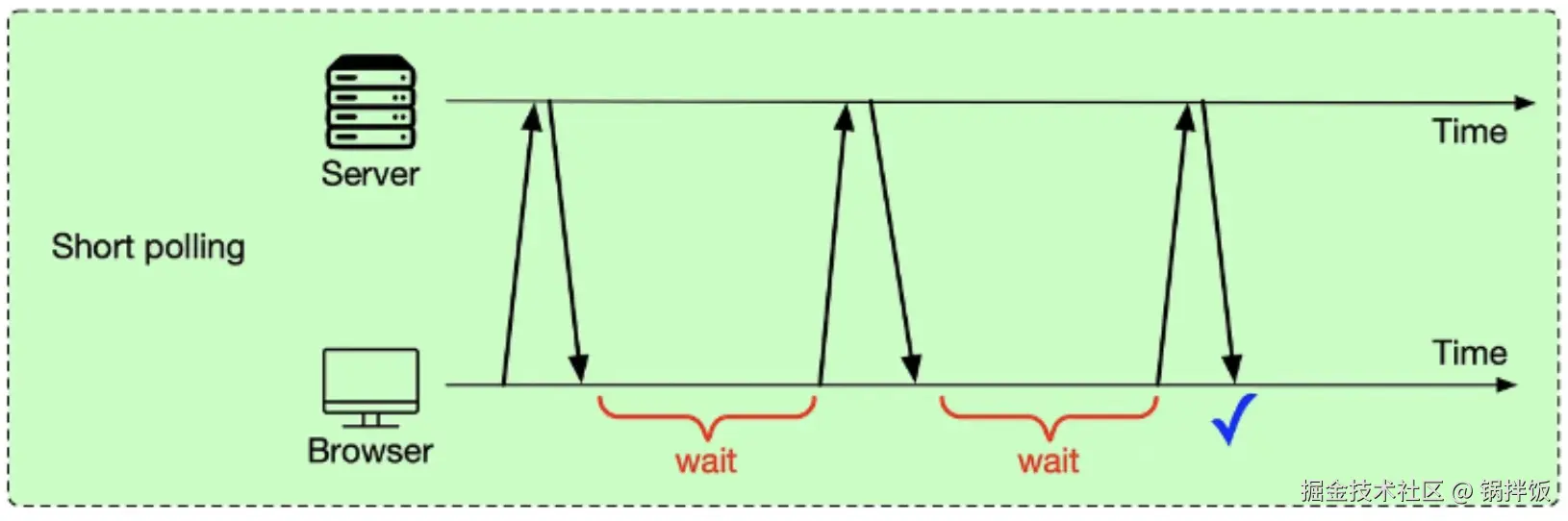 客户端定时,如每500毫秒向服务端发送HTTP请求,服务端处理完成后返回请求数据。HTTP Polling