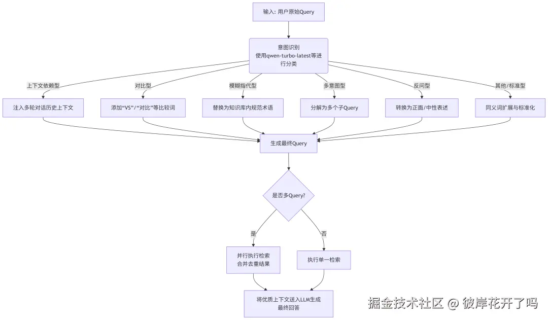 这个流程图展示了一个成熟RAG系统处理Query的完整逻辑链,其中意图识别是触发不同改写策略的开关,而 specialized 的改写策略是精准命中知识库内容的关键。