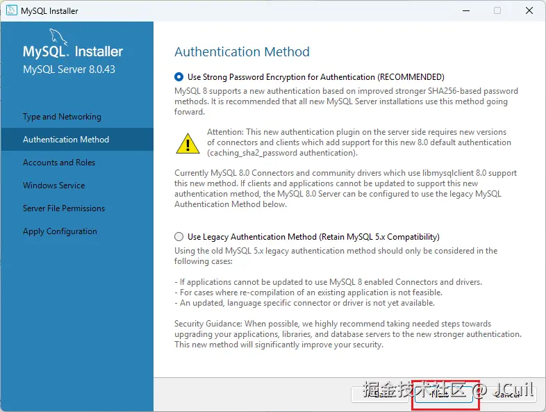 选择 MySQL 服务器的身份认证方式,根据自己实际情况选择,我这里选择默认。