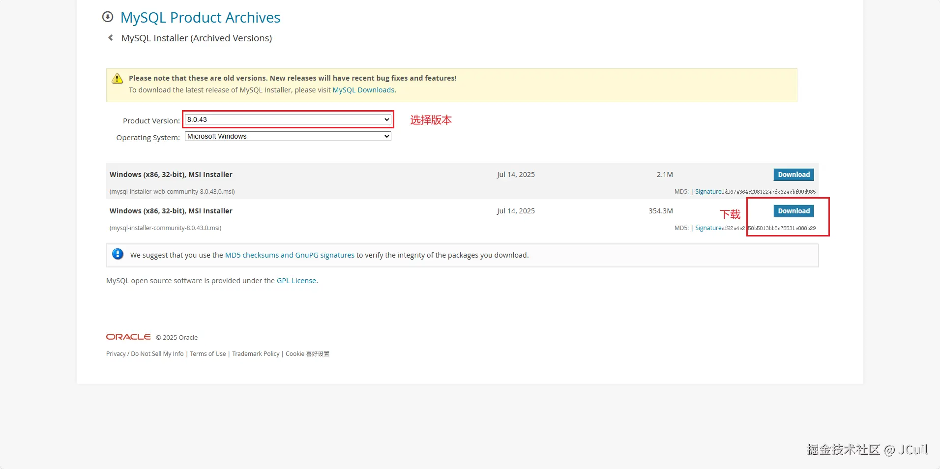 进入 MySQL 官方网站的下载页面 dev.mysql.com/downloads/ 点击 MySQL Installer for Windows ,然后选择要下载的版本及系统,下载后打开。