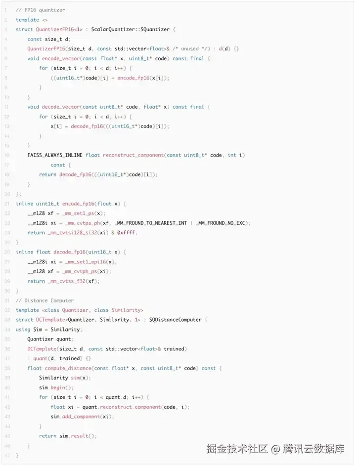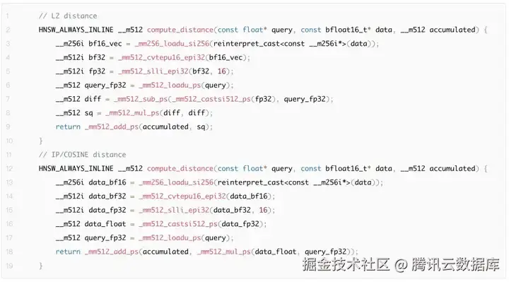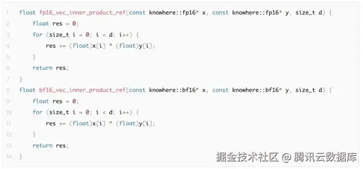 另一知名厂商的开源版本实现中,也提供了半精度浮点数量化。在实现FP16、BF16半精度向量计算时,也是先转换半精度浮点数为单精度浮点数,再进行距离运算。核心代码如下: