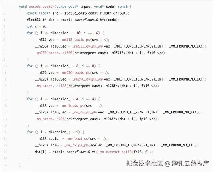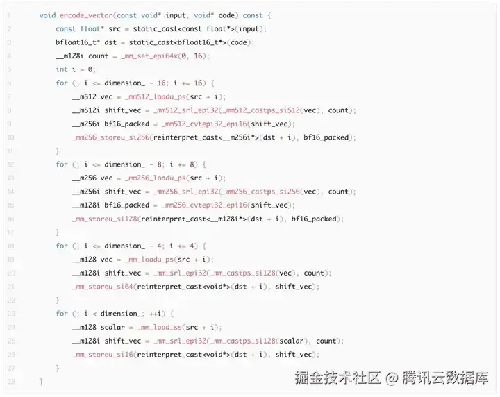 VDB内核同学采用了通过SIMD指令的方式,来完成向量压缩和相似度距离的批量计算,虽然在实现上比起直接使用标量计算代码更为复杂且容易出错,但团队秉持着为首个版本奠定坚实性能基础的理念,坚持走了一条更具挑战性的技术路线。最终,这一决策带来了卓越的性能表现和显著的计算效率提升。下面,我们将以AVX512指令集为例,简述VDB的核心实现: