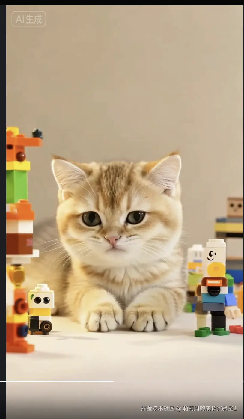 “用这张猫图做一个10秒轻松搞怪的小视频,镜头开头特写,结尾做一个近景眨眼动作,背景氛围偏乐高玩具感。”