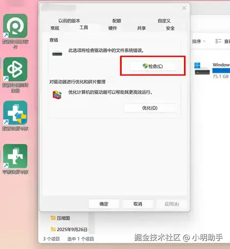 步骤2: 在“属性”的窗口中选择“工具”,然后再按下“检查”的按钮。