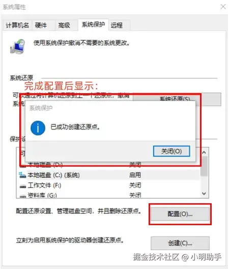 步骤2: 在“系统保护”窗口中,单击“配置”后选择需要启用的备份文件位置和状态,选择好后退出点击【系统还原】。