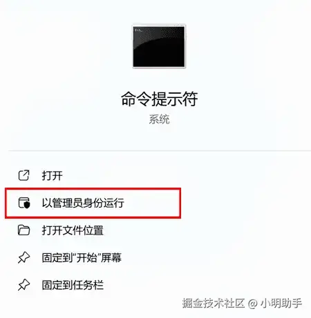 步骤1: 在【系统菜单】中直接搜索【命令提示符】,点击【以管理员身份运行】;
