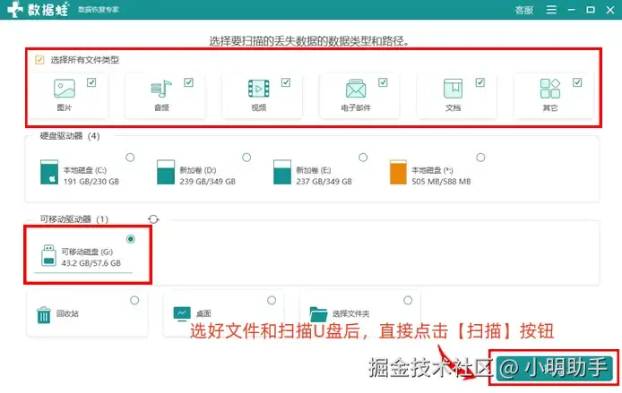 步骤1: 在首页上勾选好所需恢复的文件类型和扫描U盘,选择完毕后再点击【扫描】按钮,让软件进入扫描工作;