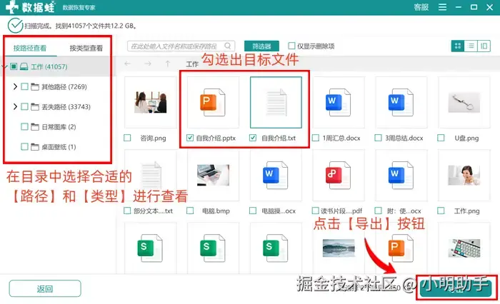步骤2: 通过软件完成扫描后,在软件的指定位置上选择需要进行恢复的文件,找不到文件也可以先通过左侧的“目录”来缩小搜索范围;勾选出所需文件后,点击【导出】;