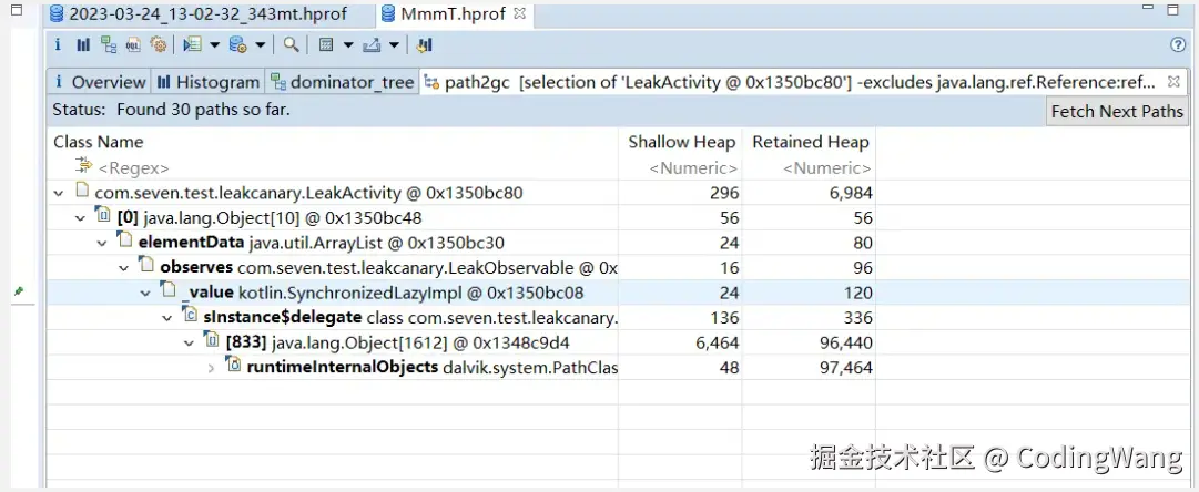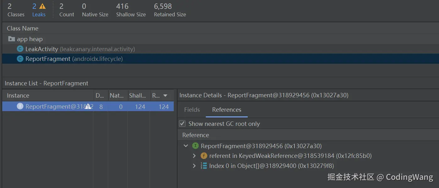 我们的上面LeakActivity已经销毁了,但是依旧有实例,可以看看到底谁引用了它导致无法被回收。同样可以通过上面的GcRoot就可以查看到,这里就不做分析了。
