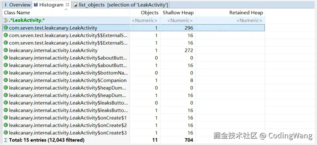 Histogram 会罗列出内存中的对象、对象个数和占用内存大小