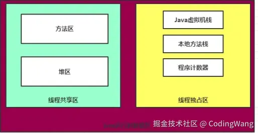 线程共享区:方法区:存放的静态常量、类信息、变量、常量池、静态方法等,堆区则是存放一些new出来的对象等。