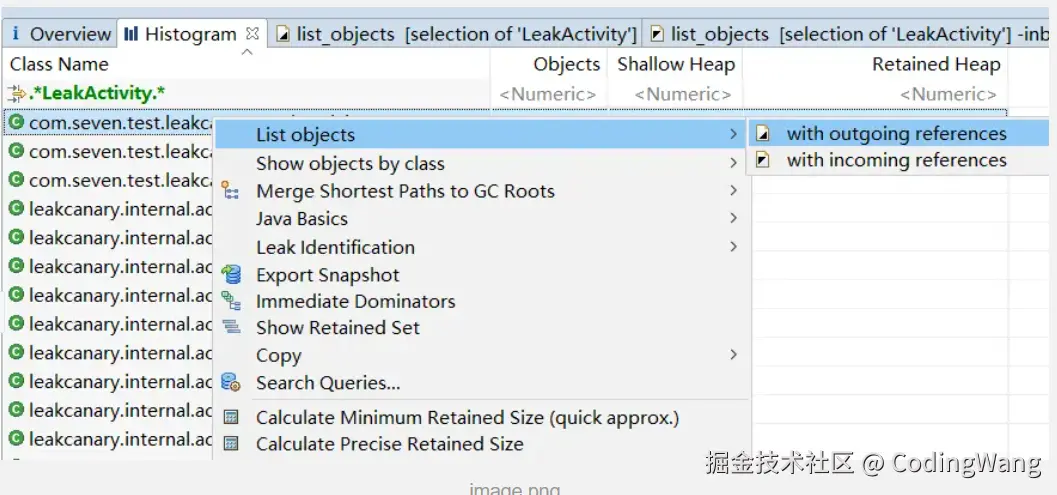 with outgoing references:它引用了哪些对象,with incoming references:哪些对象引用了它
