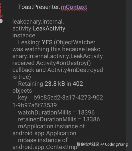 当我们返回退出时,由于LeakObservable的单例持有LeakActivity的引用,导致其无法释放,所以我们的LeakActivity就会有以下的堆栈提示: