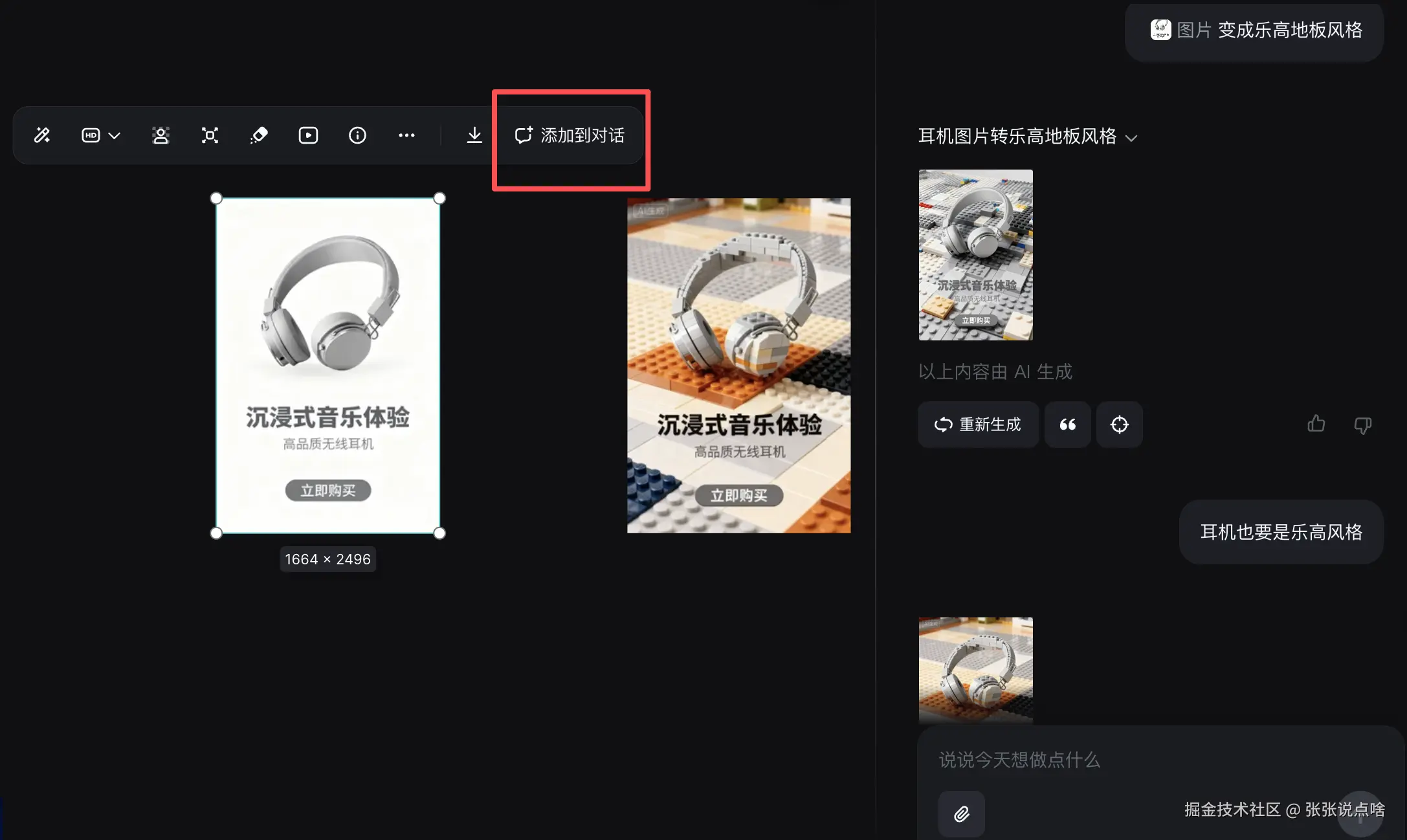 Agent Chat 省脑子:点图片 “Chat” 召唤 AI 设计类的 Agent,扔个素材 + 说需求(比如 “把耳机变成乐高地板风格”),它会主动确认细节(比如 “要亮黄色还是浅灰色乐高底?”),不用你盯全程,等着收成品就行~