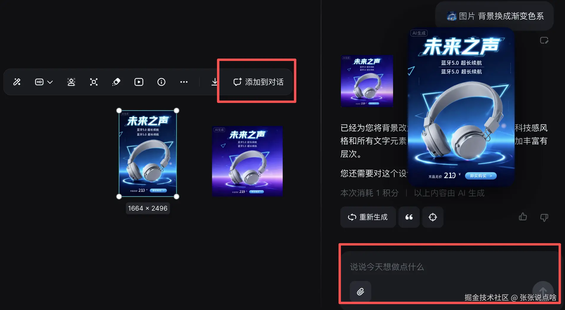 AI 编辑秒改稿:想在这张?圈出修改区域,AI 设计类的 Agent 会精准识别需求,生成后还能帮你微调字体风格;图片去背景、高清放大也能一键搞定,不用学 PS~