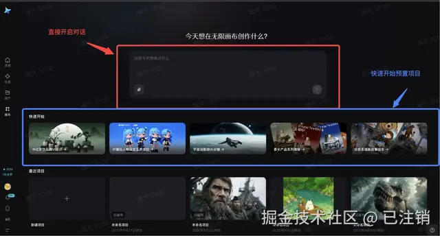 操作超简单:打开即梦,点击左侧【创作】栏里的“无限画布”,把找好的参考图(Q版造型、配色方案等)直接拖进去,用画布自带的“文本框”标注“比例参考”“配色参考”分区摆放。