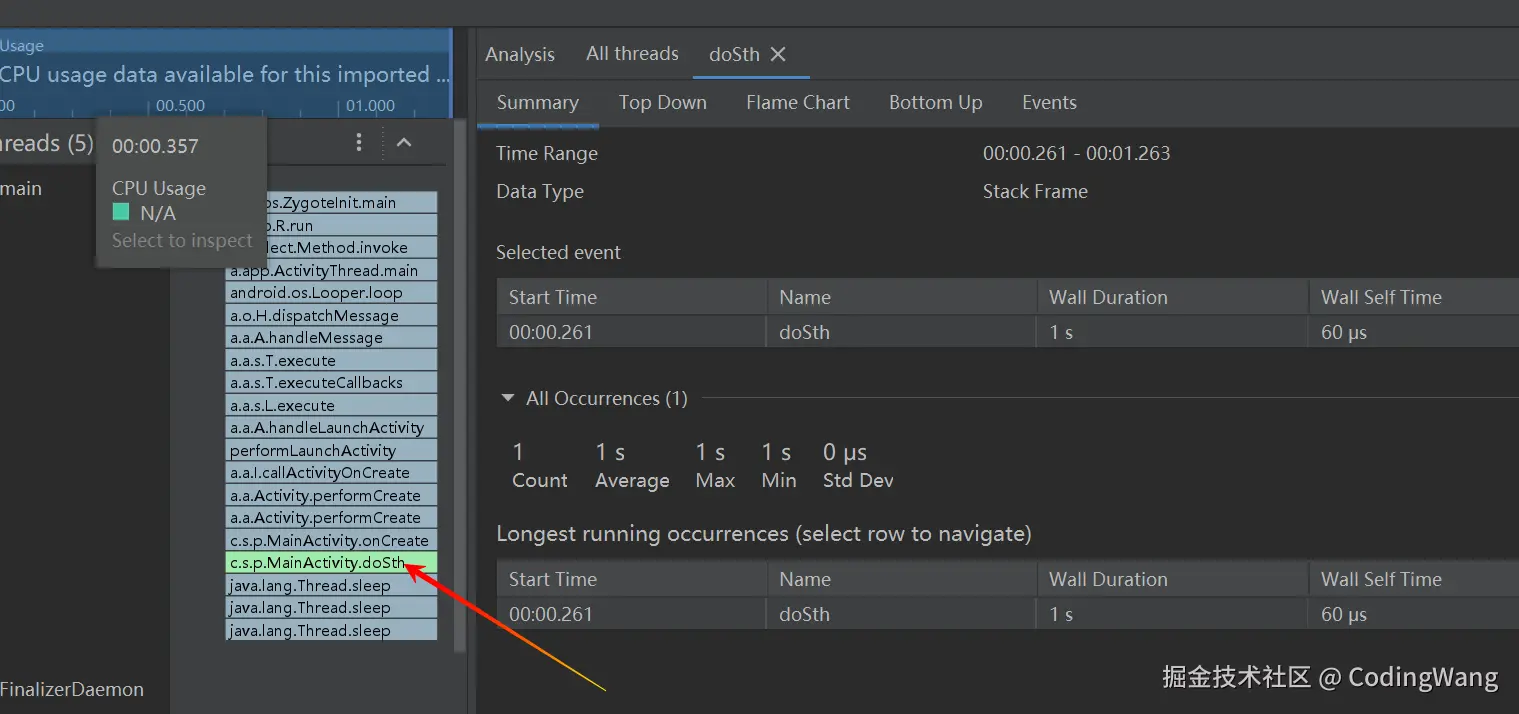 它会在/sdcard/Android/data/packagename/files;生成一个trace文件,我们把trace文件导出来,直接拖到as中查看: