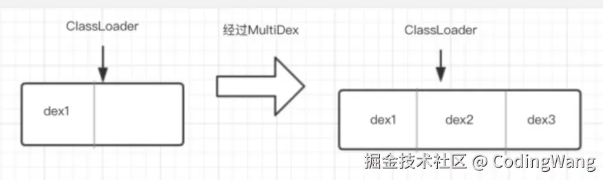 前面我们对multidex做了简单的解析,大致的流程就是压缩apk,获取dex文件并缓存起来,然后使用classLoader将其拼接到dex1后面,那其实不管是 PathClassLoader还是DexClassLoader,都继承自BaseDexClassLoader,加载类的代码在 BaseDexClassLoader中,它的大致流程就是:ClassLoader.loadClass -> DexPathList.loadClass -> 遍历dexElements数组 ->DexFile.loadClassBinaryName,我们在5.0以下的版本由于只有主dex,没有dex2...所以我们加载时会出现找不到类的错误,但是我们通过Multidex.install可以将dex拼接主dex中去,大致流程是: