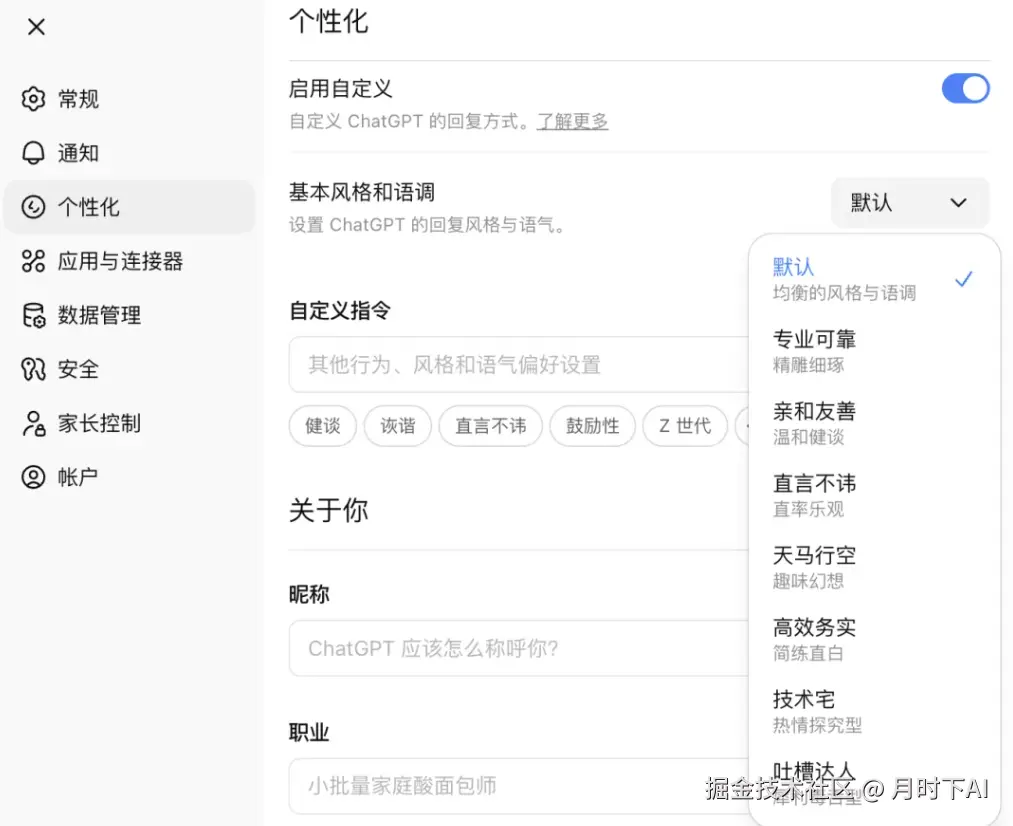 大家可以在官方 账号设置 -> 个性化 -> 基本风格和语调 中进行相对应调整
