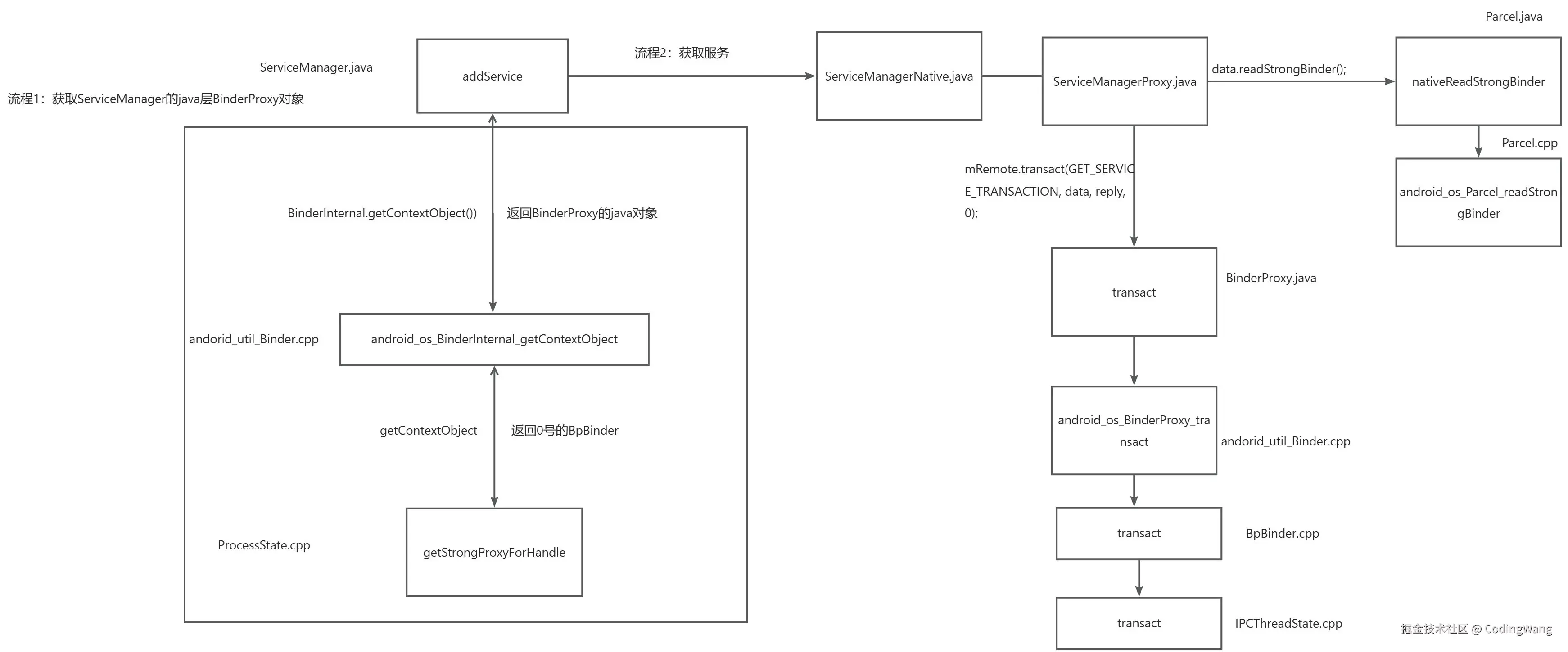 - 获取BinderProxy的java对象,获取0号bpBinder(ServiceManager的代理)