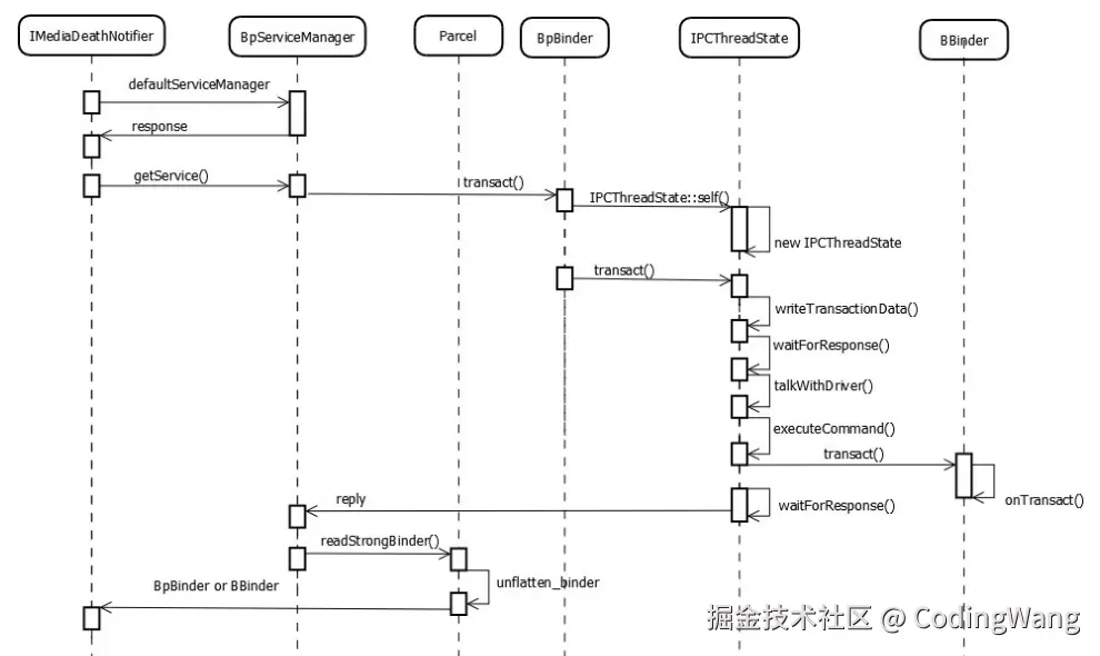 - get方法执行,通过mRemote.transact(GET_SERVICE_TRANSACTION, data, reply, 0)和serviceManager交互将flatter_binder写入到reply中,在通过parcel.java经过的jni和一系列转换得到java的BinderProxy(底层是服务的bpBinder)