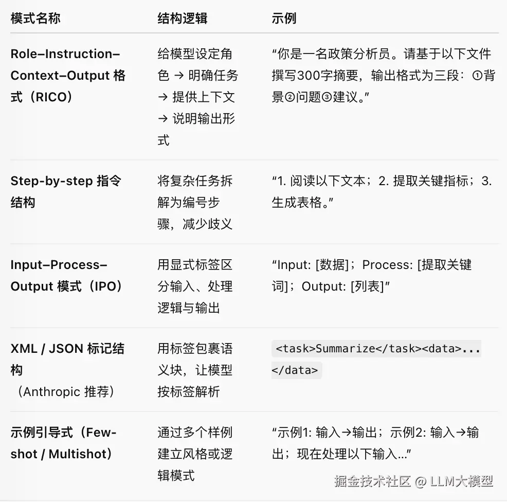 不过,随着大模型在复杂任务中的使用逐渐系统化,业界其实已经形成了一些结构化提示(Structured Prompt)的通用模式,这些结构可以显著提高模型理解度与输出一致性。