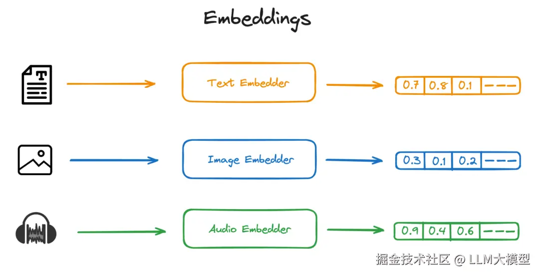 - 数据向量化:外部知识(文本、文档、图像等)会经过“向量化”过程从其原始格式转换为向量表示(embeddings)。那么执行这个“向量化”过程的就是一个嵌入模型(Embedding Model);