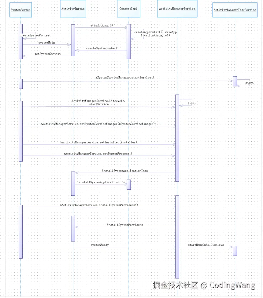1. 创建SystemServiceManager 对象,用来启动后面的服务 1. 启动系统服务,共分为三种系统服务:系统引导服务(Boot Service)、核心服务(Core Service)和其他服务(Other Service) 1. 在引导服务(Boot Service)中启动ATM、AMS服务 1. 在其他服务(Other Service)中完成AMS的最后工作systemReady