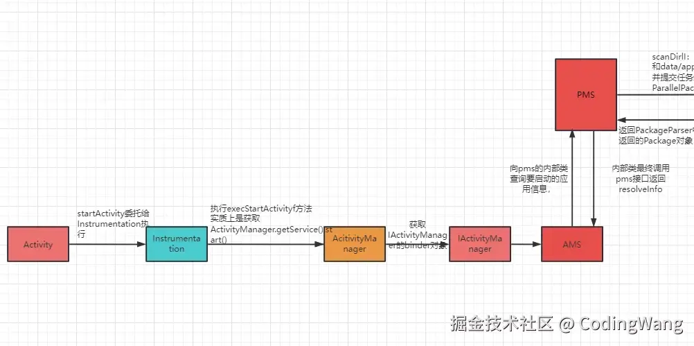 - PackageManageService简称PMS,它是用来管理所有包信息,包括应用安装、卸载、更新以及解析AndroidManifest,将解析出来的数据生成javabean,保存在ArrayList中。