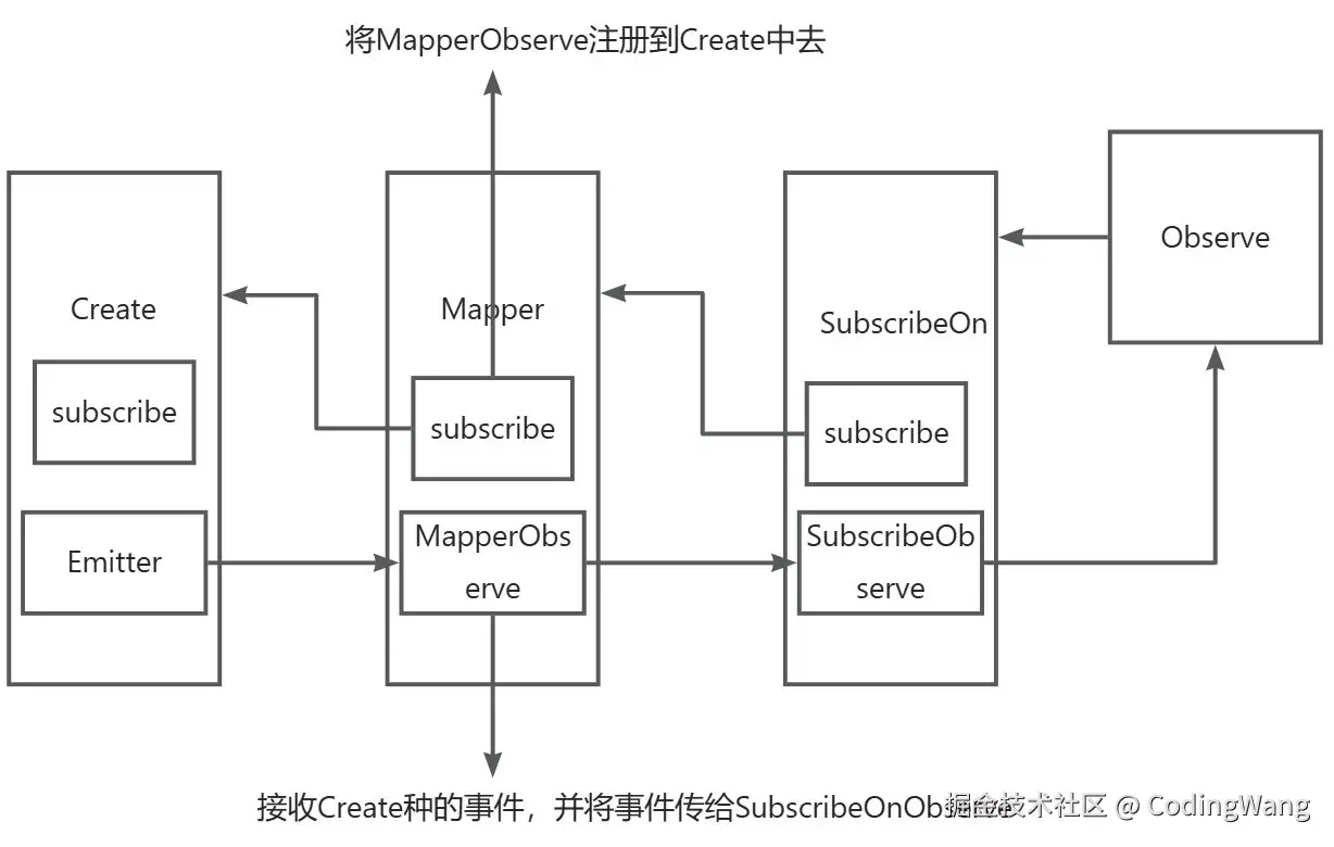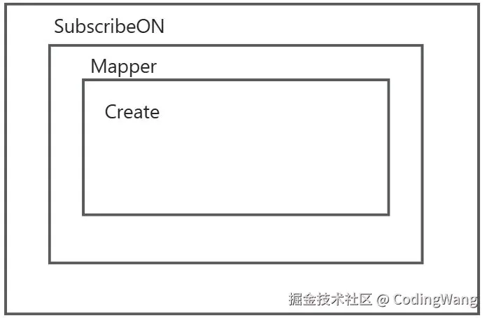 2.捋清楚订阅关系,SubscribeOn是由外部订阅,内部订阅Mapper,Mapper是由SubscribeOn订阅,内部订阅Create,Create的被Mapper订阅,内部订阅事件发射器。