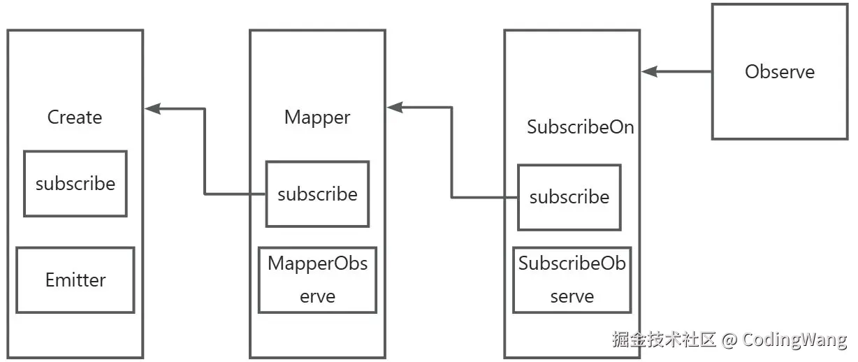 3.捋清楚执行关系,我们上面已经分析了套娃的过程以及订阅过程,我们再来看看执行过程,当create中的emitter发射事件时,(这个也会在前面指定的线程执行,因为我们的create的订阅中监听了emitter事件的执行),create中的观察者会被执行,因为create是被mapper观察者的,create持有Mapper种的观察者引用,所以mapper的观察者会被执行,又因为mapper是被subscribeon观察的,Mapper中持有subScribeOn的观察者的引用,那subscribeon是被外部观察者观察的,那么外部的观察者就得到了执行。
