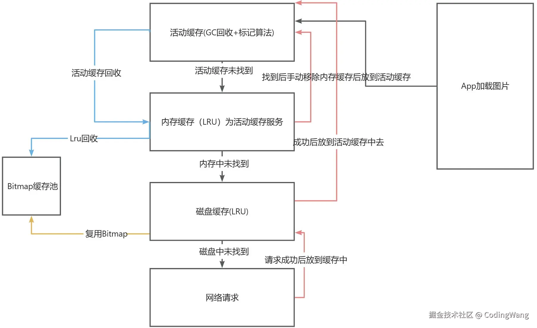 1.活动缓存:正在使用的缓存,加载时优先查早活动缓存,若无继续往下查找,它的回收策略是弱引用和gc,回收后放置内存缓存中,来源可以是内存缓存或磁盘缓存,注意内存缓存找到后会清楚掉内存缓存;