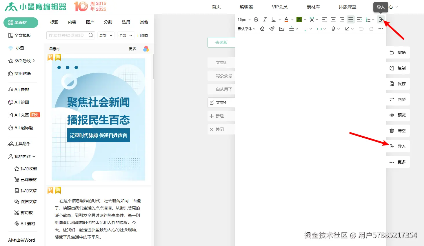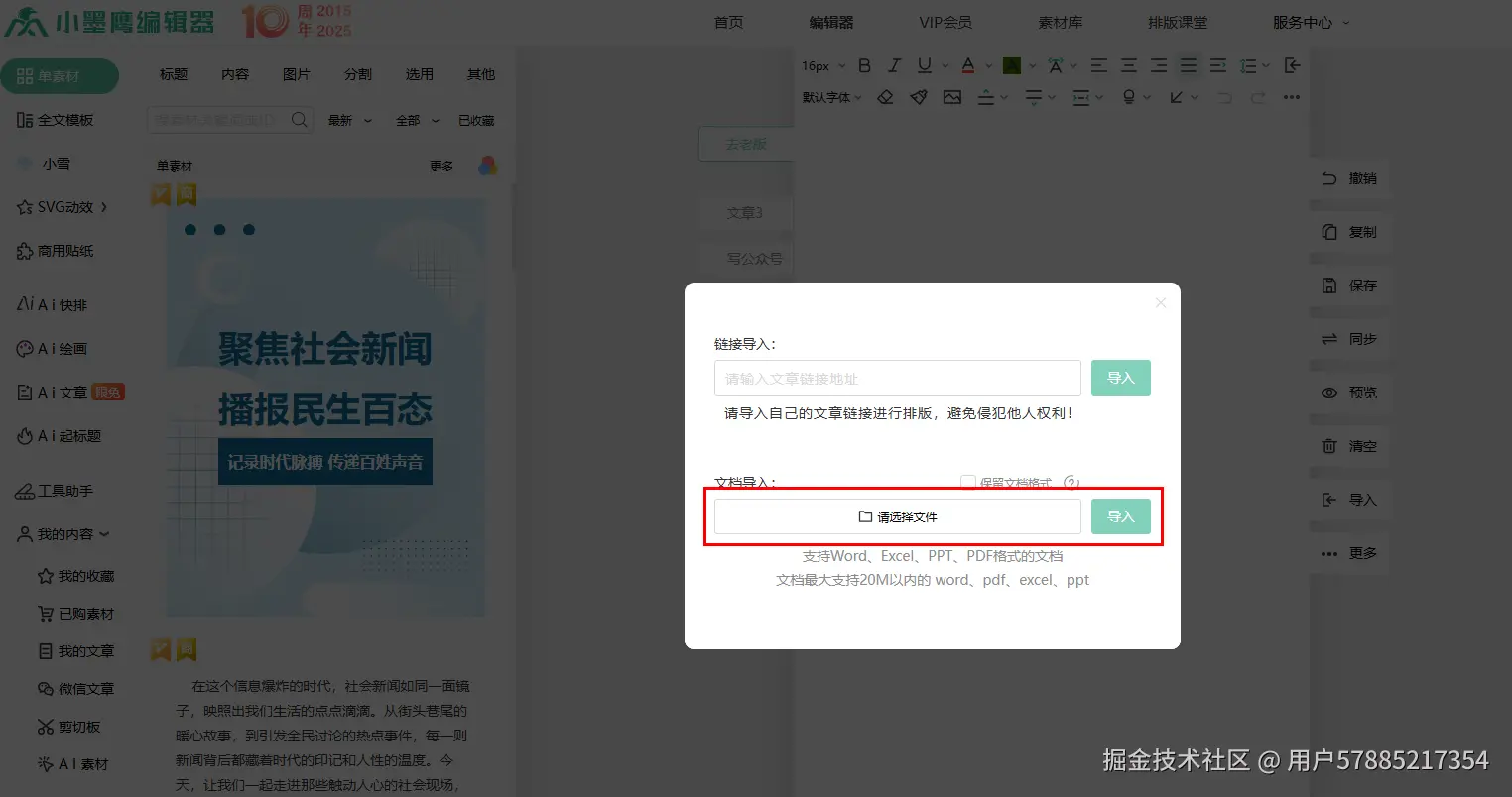 打开小墨鹰编辑器,有两种方式找到导入功能:要么点击顶部导航栏的「导入」按钮,要么点击编辑区右侧的「导入」按钮;