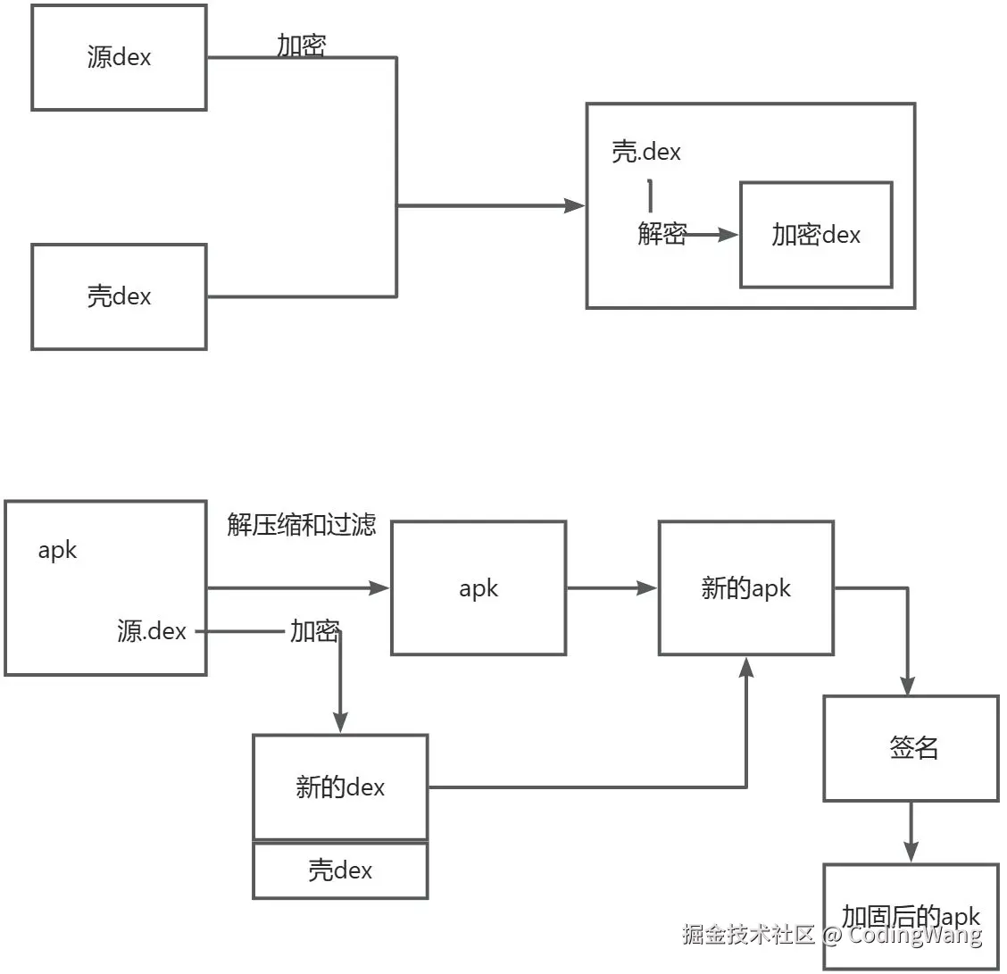 它的原理就是对部分dex进行加密,并且配套一个壳dex,这个壳dex的作用是用来解密这个加密后的dex文件,然后对apk重新打包签名。