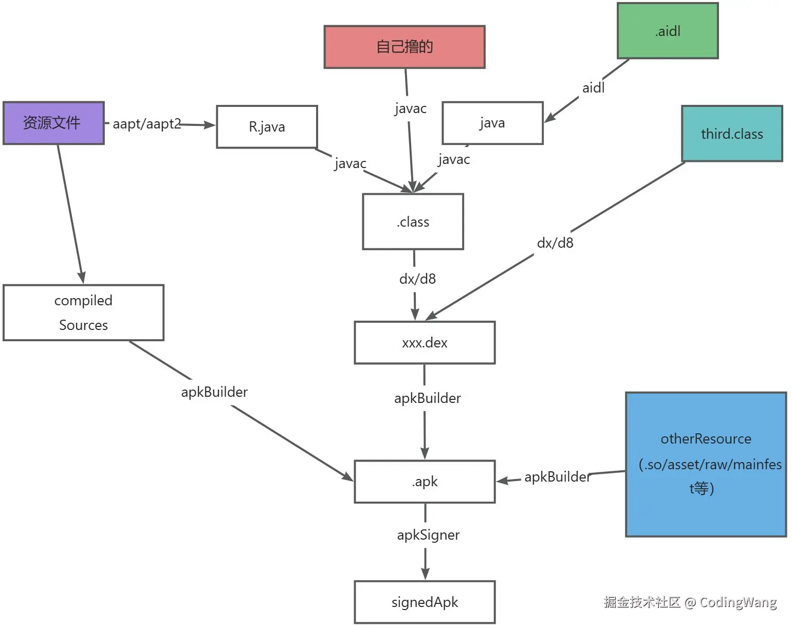 我们用as打包时,gradle会借助build-tools中的一些命令帮助我们编译,比如aapt/appt2编译资源文件,aidl.exe帮助我们生成java代码等,然后使用dx/d8编译生成android虚拟机运行的dex文件,如果设置了multdex会帮助我们打包多个dex文件,随后资源文件、so、asset\manifest和dex一起打包成.apk文件, 我们就可以对apk进行zipalign对齐在进行签名,签完名之后在最后完成了apk的整体打包流程。
