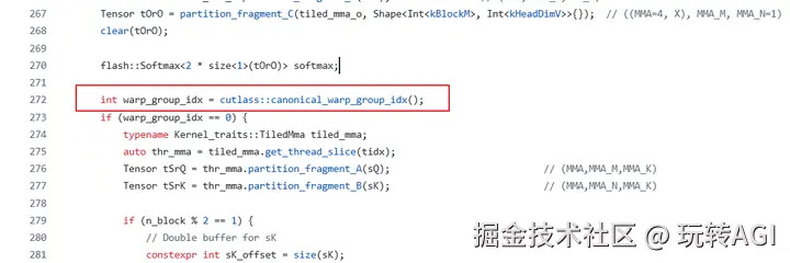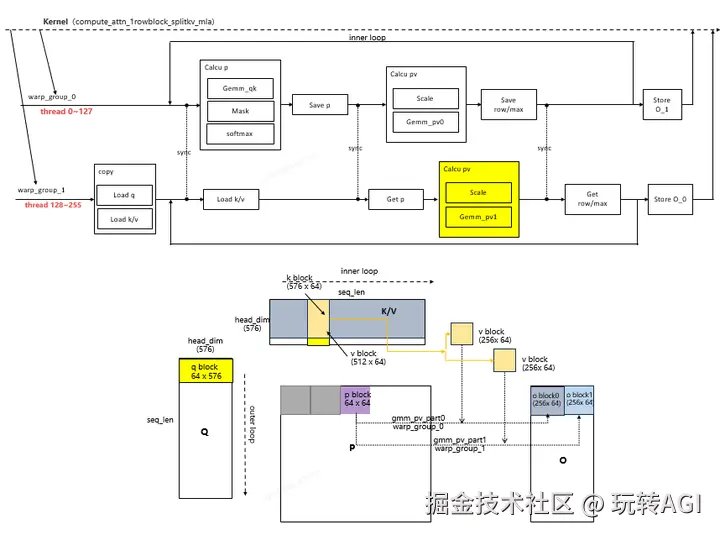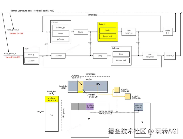 - warp_group_0(线程0~127): 负责进行attention scores运算、mask、softmax、部分PV计算。