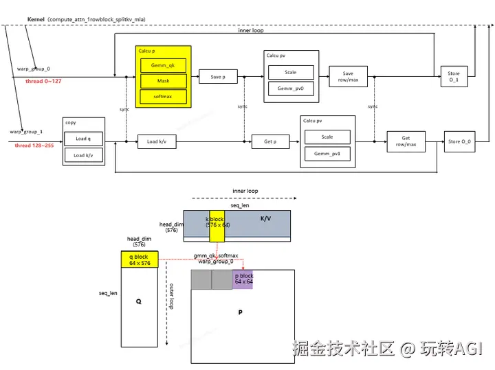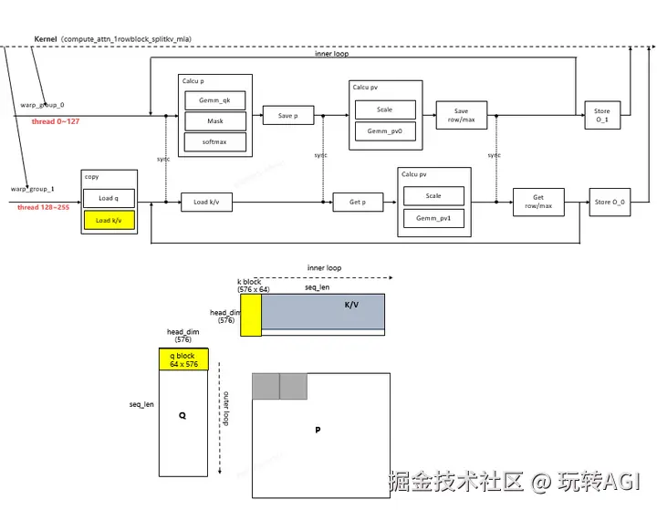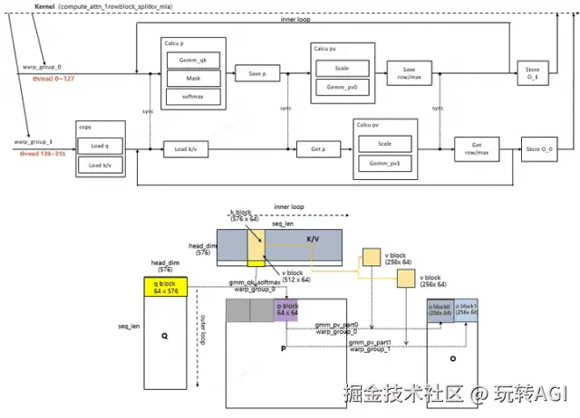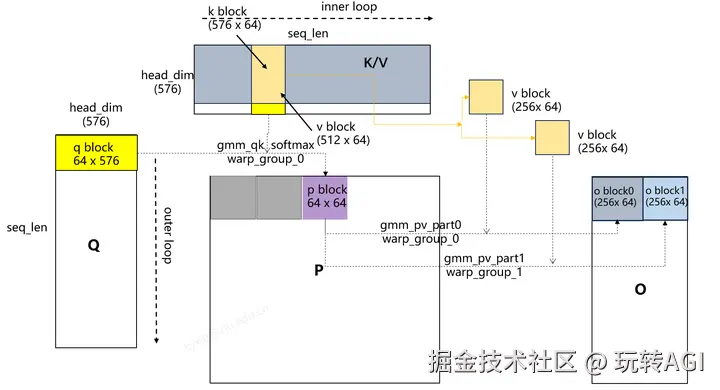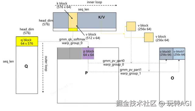 输入、输出明确后需要对KQV进行分块计算(按照FlashAttention类型原理), FlashMLA的分块逻辑如下: