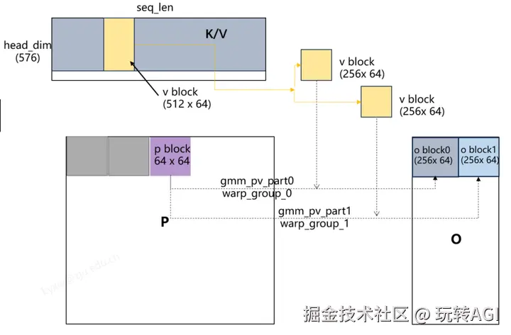 - 从V取v_block单位,然后分块成两份,分别与p_block计算得到o_block0和o_block1刷新到结果O上;