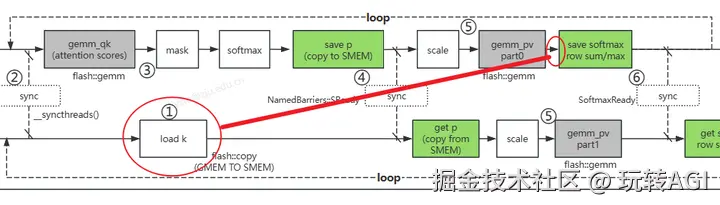 - warp_group_0将P值copy一份到共享内存中,接着warp_group_0和1进行一次同步, 确保copy完成后。warp_group_1从共享内存中加载一份P值;