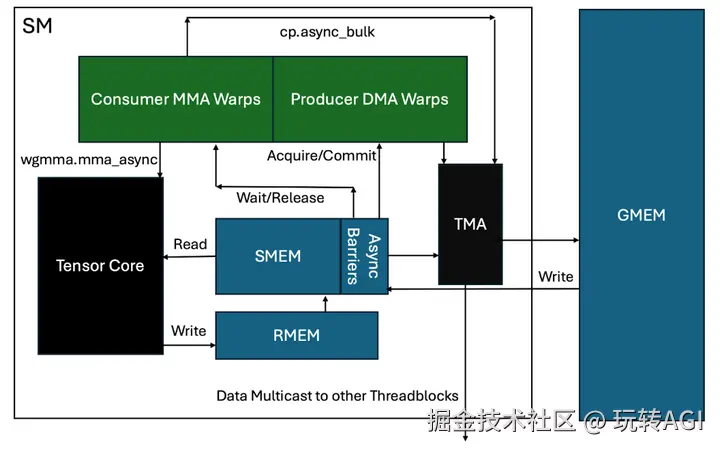 - TMA(Tensor Memory Accelerator):TMA 允许在 GPU 的全局内存(Global Memory)和共享内存(Shared Memory)之间异步传输