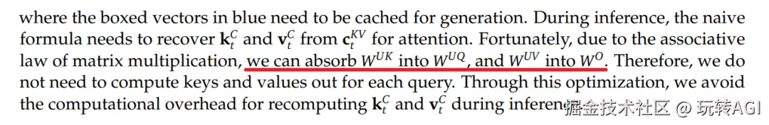 在deepseekV2中有提到矩阵W可以调整,具体是WUK转移到WUQ计算中,WUV转移到WO计算中。