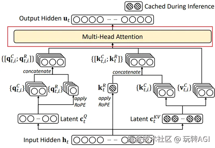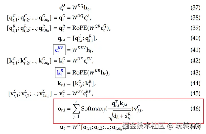 一般而言,计算MHA时需要Q/K/V三个输入值,而MLA由于引入升降秩操作,算MHA时输入值发生了变化。 MLA的公式如下,FlashMLA完成(公式46)的计算。