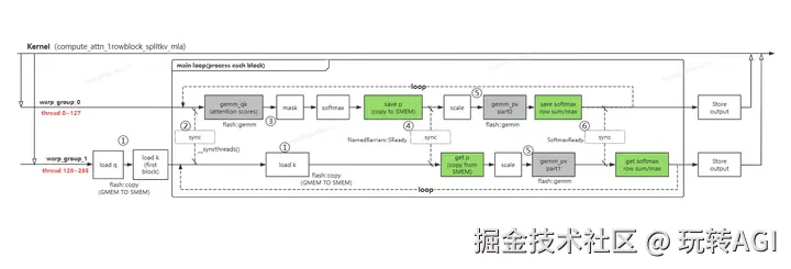 有了对ping-pong方法的理解后,阅读FlashMLA的计算逻辑就更容易了。FlashMLA里面也使用了两个warp组。与ping-pong不同的是,这两个warp组是一种协作关系。