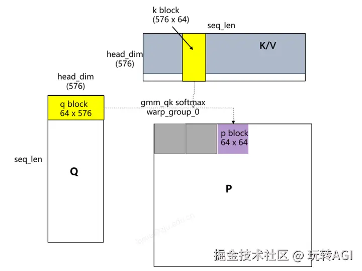 - 从Q取q_block单位,从K取k_block单位完成qk运算'、softmax运算得到p_block;